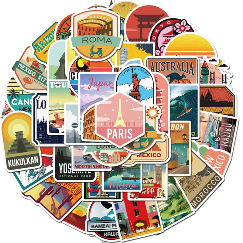 Promotion 50 pcs Travel city scenery Graffiti Waterproof Skateboard Travel Suitcase Phone Laptop Luggage Stickers Cute Kids Girl Toys