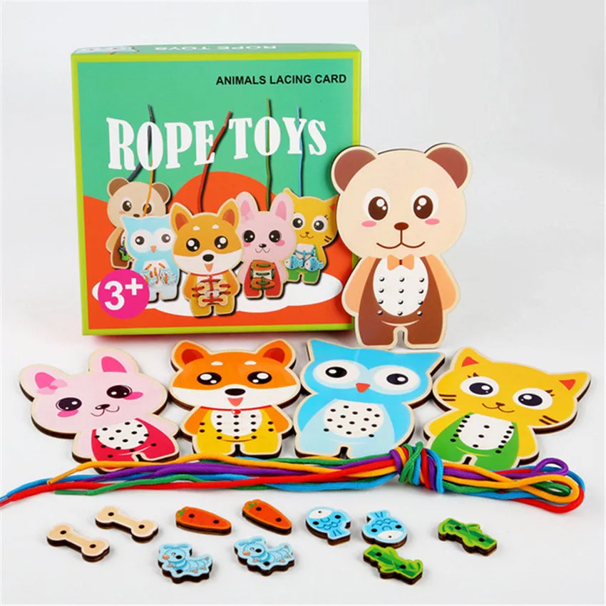 Discounts Children Wooden Puzzle Stringing Board Game Creative Animal Fruit Kindergarten Montessori Teaching Aids Rope Toys Kids Gifts
