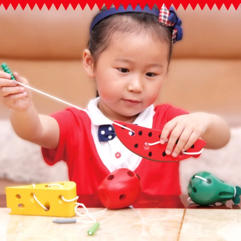 Offer Kid Montessori Materials Wooden Threading Toys Lacing Cheese Fruits Education Learning Toys for Children Kindergarten Funny Game